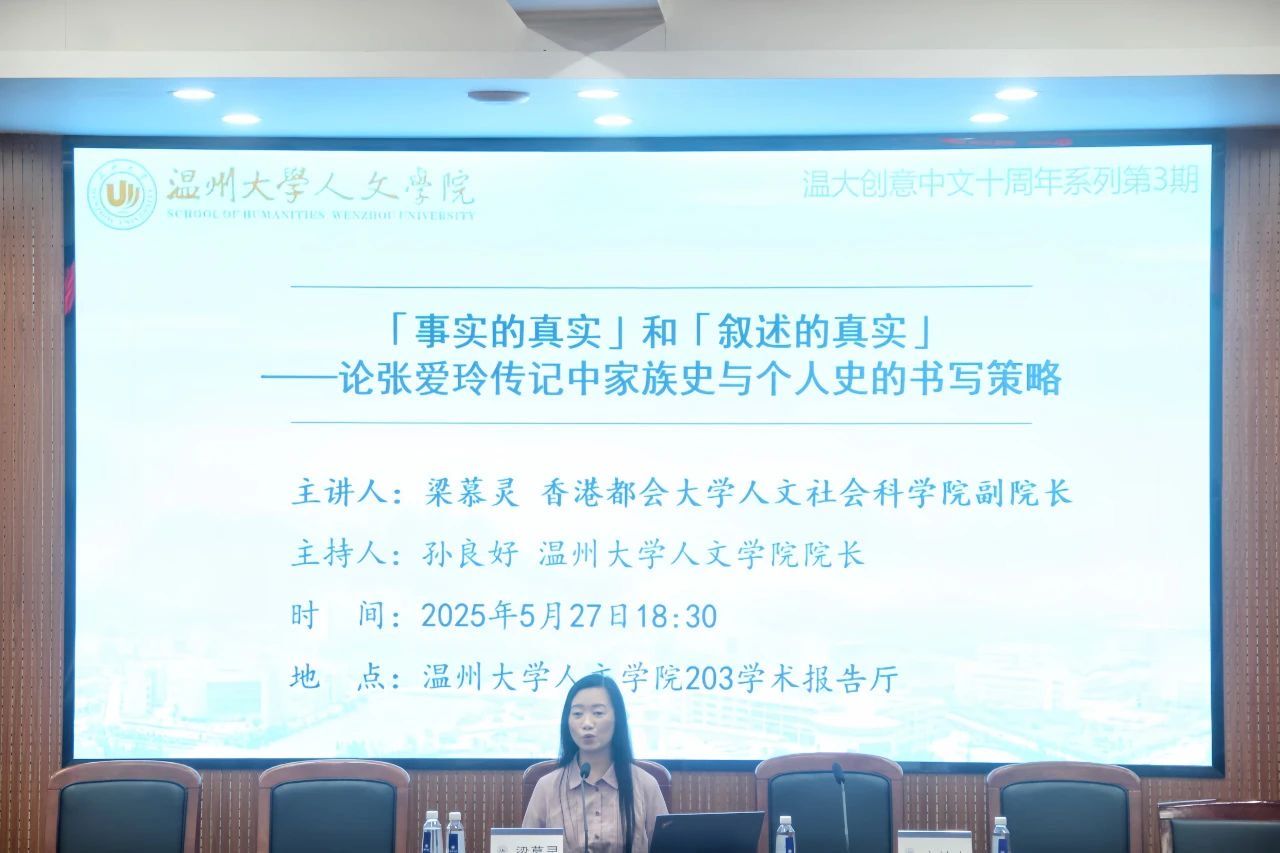 2025年5月27日晚,我院特邀香港都会大学人文社会科学院副院长、田家炳中华文化中心主任梁慕灵,在203学术报告厅开展以“‘事实的真实’和‘叙述的真实’——论张爱玲传记中家族史与个人史的书写策略”为主题的讲座。讲座由我院院长、图书馆馆长孙良好教授主持,参与讲座的听众有香港都会大学人文社会科学院的邵栋博士、余文翰博士、温州大学创意中文系副主任李广旭老师、刘卫东老师以及本研学生。现场师生积极参与学习与讨论,学术氛围浓厚。