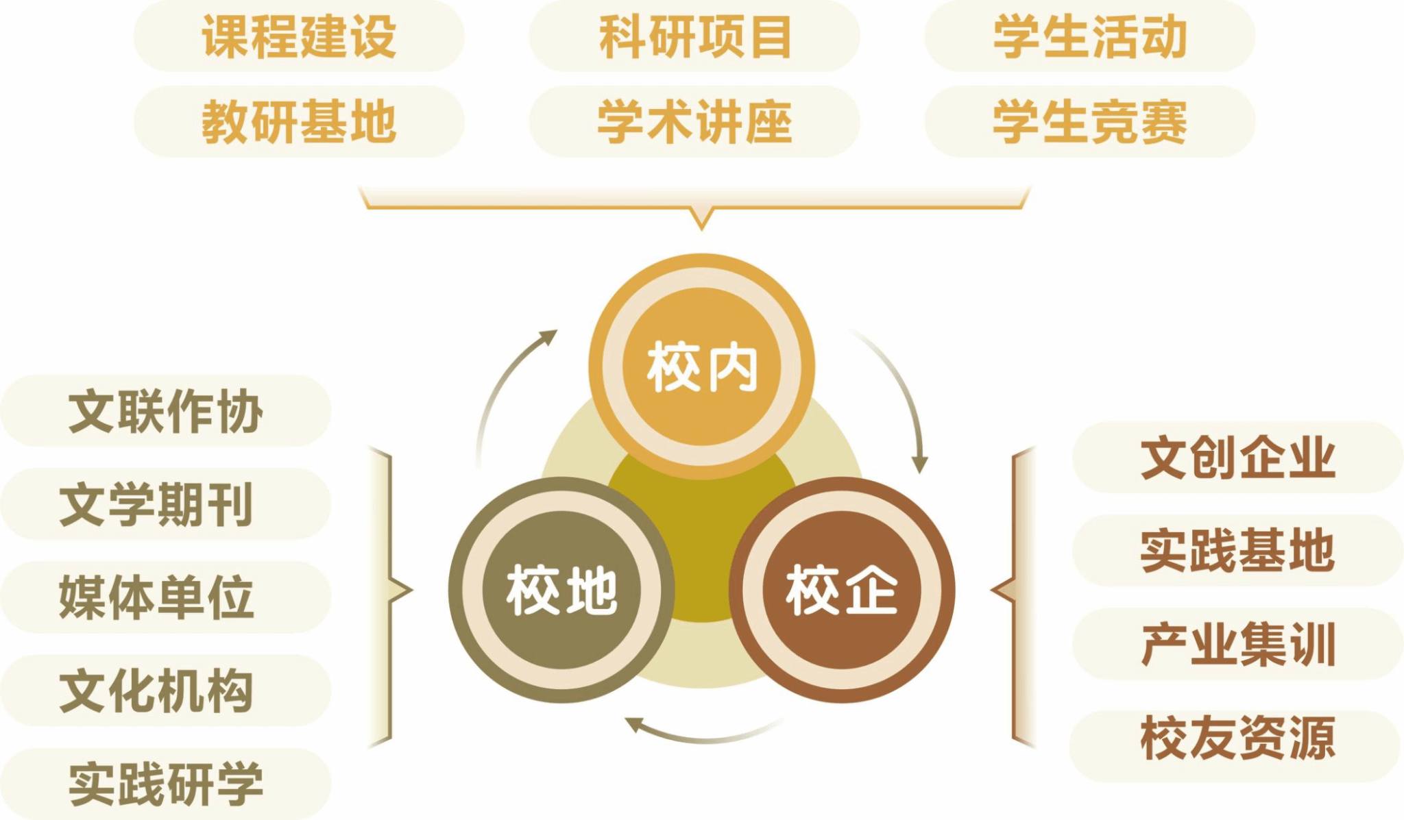 本专业实现中文、历史、广告等专业资源共享,罗山讲堂、瓯越学术讲座等提供前沿学术资源,国家语言文字推广基地等教研基地引导学生融入地方,“瓯语史”“《温州大典》研究编纂工程”等科研项目提供学生实践机会,打造“文学周”“百年语文”等七大校园文化品牌,“知语识文”国家通用语言文字推广等活动培养学生实战能力,已出版学生作品集《文字作坊》9辑、《文轩》16期、文学奖十周年作品选《拾年》等。借助温大创意写作研究中心、网络文创研究院等平台加强与地方联动,举办写作工坊、作家分享等学术活动组织学生参与专业发展,对接数创空间等文创市场组织学生参与行业发展,锻造学生的专业特质。将课堂搬进世界温州人家园、瓯海数创园等文创园区,开设剧本杀集训营等产业培训,邀请行业专家进实践课堂,推荐学生入企见习实习,助力学生成长成才。