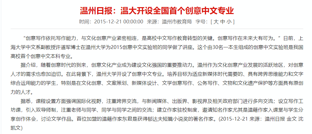 温州大学汉语言文学(创意中文实验班)系入选国家一流本科专业建设点的汉语言文学专业的方向之一,文脉可以追溯到晚清教育家孙怡让先生于1906年创办的温州师范学堂。2015年,温州大学汉语言文学专业创设创意中文实验班,成为国内最早进行中文创意写作教育教学和人才培养的高校之一。2016年建设驻校作家制度;2019年入选国家一流本科专业建设点;2021年成立温大创意写作研究中心,与上海大学、香港都会大学联合打造《中国创意写作研究》集刊的学术平台。拥有教育部国家语言文字推广基地、浙江省哲学社会科学重点A类研究基地“浙江传统戏曲研究与传承中心”等。专业以传统中文为基底,整合文史哲和文化创意资源,强化写作实践教学,致力于培养专业知识和人文素养“双优”、口头表达和书面写作“双高”、文学创作和文创生产“双强”的“三双”应用型高级人才。