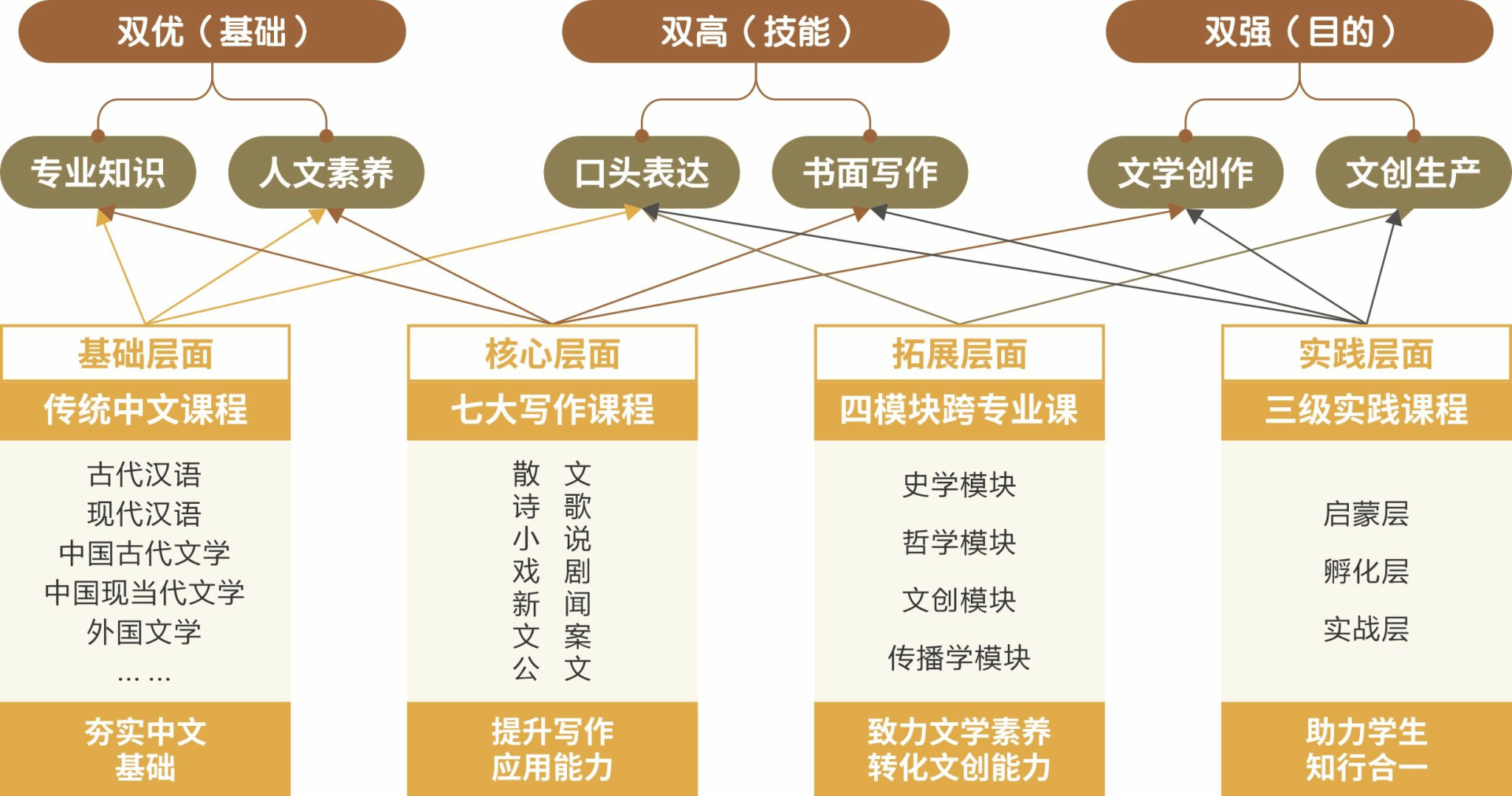 本专业注重产业能力导向,建构“基础、核心、拓展、实践”四个层面的课程矩阵。基础层面开设中国古代文学、中国现当代文学、外国文学、文学概论、现代汉语、古代汉语等课程。核心层面强化散文、诗歌、小说、戏曲、新闻、文案、公文等七大写作类课程。拓展层面设列史学、哲学、文创、传播学等四个跨专业模块的课程。拓展层面打造包括写作实践、文化考察、文化产业综合实训等在内的启蒙、孵化、实战三级实践课程。
