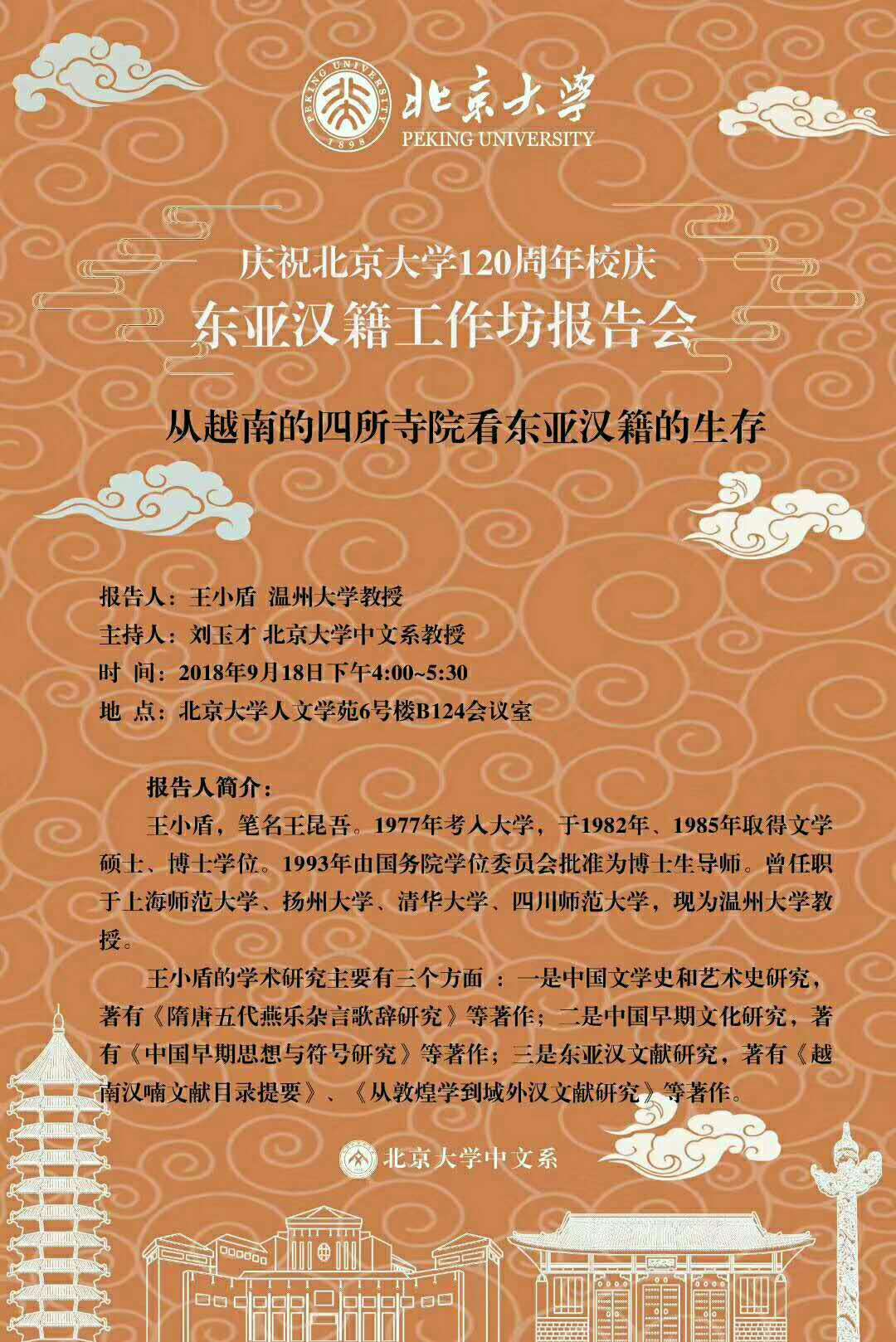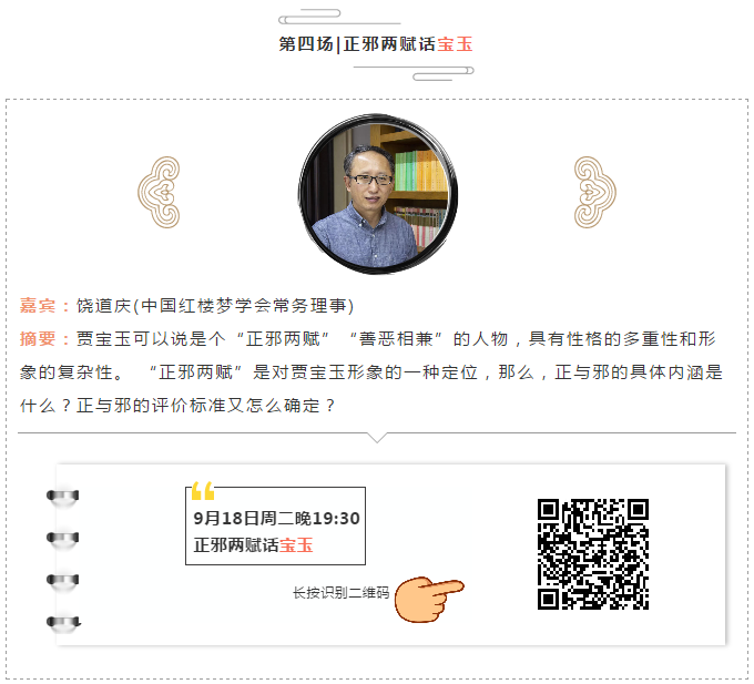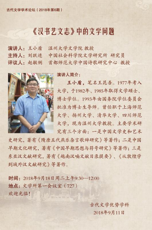 9月18日,对于中国人来说,今天是一个特殊的日子:勿忘国耻,铭记历史。对于麻豆视频 来说,今天也是一个值得书写的历史。今天上午9:30-12:00,温州大学特聘教授王小盾在中国社会科学院文学所第一会议室主讲古代文学学术论坛第6期 《<汉书艺文志>中的文学问题》。今天下午4:00~5:30王小盾教授将在北京大学人文学苑6号楼B124会议室作题为《从越南的四所寺院看东亚汉籍的生存》的主题报告。今晚19:30开始,中国红楼梦学会常务理事饶道庆教授将在北京的恭王府开讲《“正邪两赋”话宝玉》,这是北京青年报"青睐"线下活动携手恭王府举办"走进红楼梦中人——恭王府与《红楼梦》“主题系列讲座的第四场。