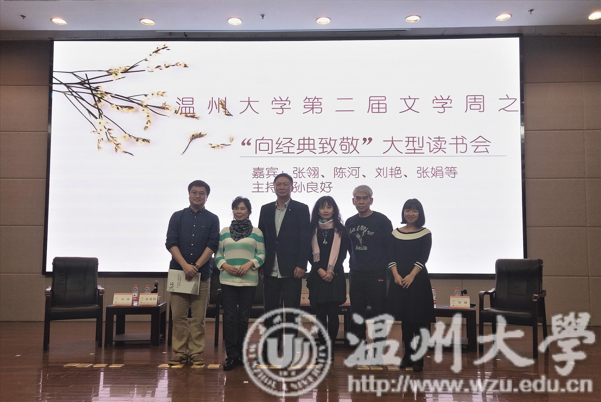 活动开始后,孙院长向我们隆重介绍了五位嘉宾,并提出在这个众声喧哗、浮光掠影的社会里,我们要沉下心来阅读经典。之后,各位老师以“读经典的必要性”为主题展开了讨论。孙院长提出:“阅读经典就是‘无用而自有为‘,年少时应该博览群书、披沙拣金。”张翎通过她年轻时的经历告诉我们:“经典是年轻时营养的钙片”,形象地解释了人与经典的关系并告诉我们要学会与经典对话。随后,刘艳告诉我们文化素养的养成应该从阅读经典开始,她以沈从文的《边城》和萧红的《呼兰河传》为例,教导我们读经典不能教科书式的阅读,要回到原作、现场以及作者的人生经历来感受一个作家写作的变化。紧接着,陈河语重心长地告诉我们读经典要从年轻开始,投入全部精力去读自己喜欢的经典。张娟着重讲述生命哲学,通过生命哲学启示我们每一个个体去发现经典,面对自己、享受孤独之美。