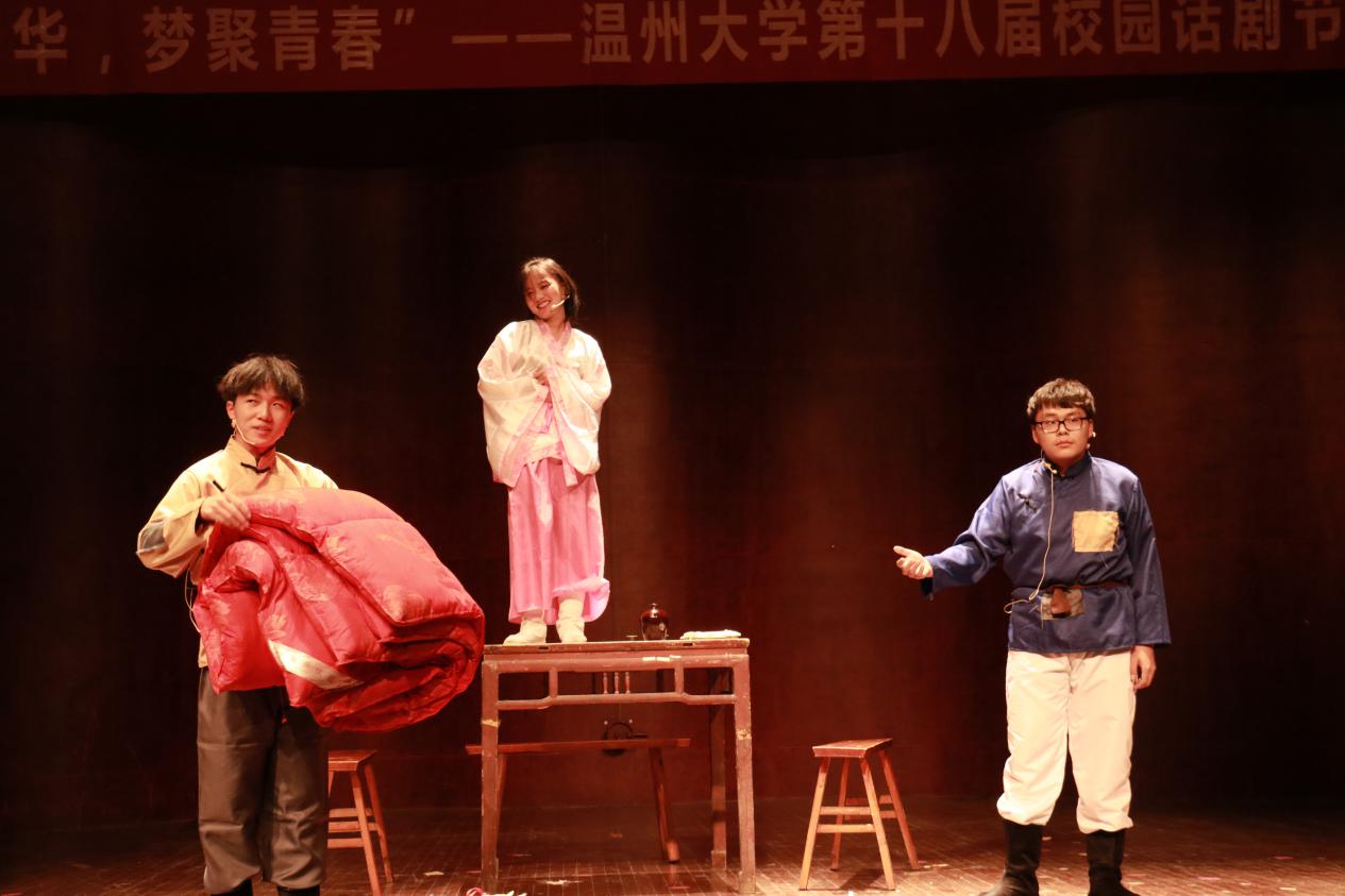 本次话剧之夜在由农历剧社出演的《收信快乐》中拉开帷幕。从眉青目涩到白发苍苍,从一间教室到大洋两岸,我们这一生都在忙于得到失去、相拥离散,“我曾欣喜地看着你的到来,也无可奈何地任你远去。”有人沉浸爱情的喜悦,也总有人缅怀一段曾经的感情。“夏威夷金子般灿烂的阳光,不及你眉眼悦动笑意莞尔;维也纳再悠扬动听的音乐,不及你低低一声问候云淡风轻。”两个灵魂关于爱的对话,跨度四十余年的时间,一部关于煎熬、关于等待、关于承诺的温馨故事,在这里开演。第二场戏是由风华绝代话剧队奉上的《刘伯温课本剧》,一代传奇功臣刘伯温,才华远近闻名,国家存亡之时,用寥寥数语点破大难密云;锦囊妙计泉涌,用清廉之心秉持刚正不阿。青葱瓯越大陆之上,他们的表演也同样缔造了一段传奇佳话。下半场,鹿鸣剧社上演话剧《暗恋桃花源》。每个人心底都会藏着两样东西,一个是一份永远实现不了的爱情,叫“暗恋“;一个是永远到不了的地方,叫“桃花源”。“这些年,你有没有想过我” ,没有歇斯底里,却句句打动人心。一个舞台,两出戏剧,喜剧不喜,悲剧不悲!试论爱情?嘻笑玩乐,至悲至喜,荒诞之中不断撞击的矛盾,便是生命永恒的秩序。在最后的全场演员的合照中,此次视听盛宴落下帷幕。