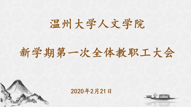 2月21日下午,我院召开新学期全体教职工大会,由于处于防控新冠肺炎疫情的特殊时期,大会首次以网络视频形式召开。学院领导班子及全体教职工参加本次会议,会议由学院党委书记吴静主持。