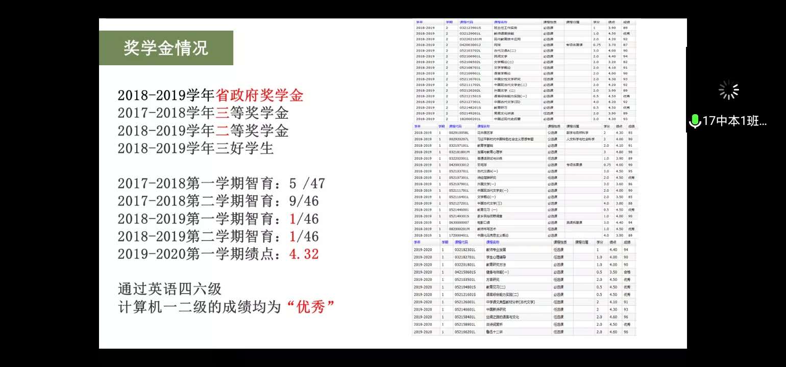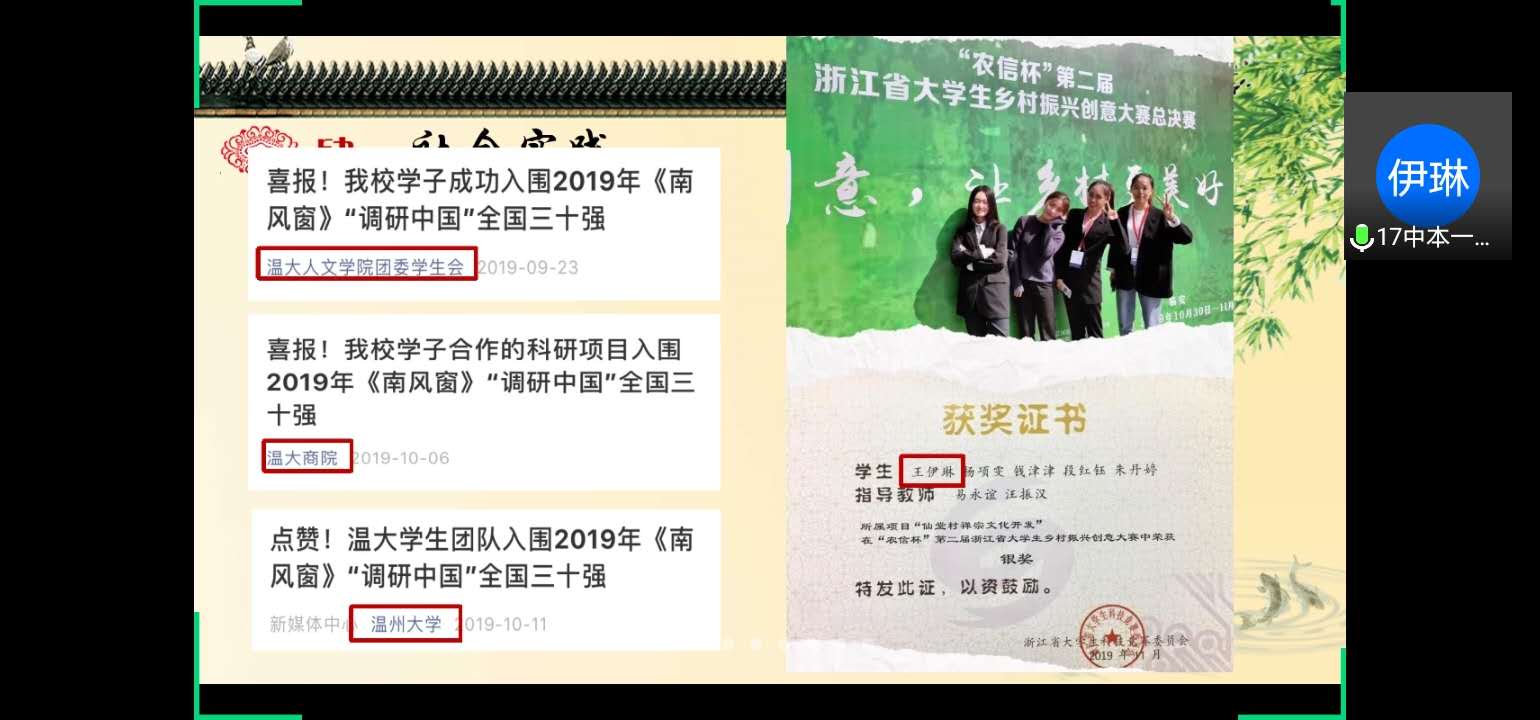 每一份未来都值得期待,每一份荣誉都挥洒着汗水。参评的每位学生以PPT和演讲的方式展示了自己在大学期间的所获所得,表现出了积极向上的精神风貌。经过个人展示和评委线上投票,16历史倪羽筝和17中文1王伊琳将被拟推荐至学校参加评选。