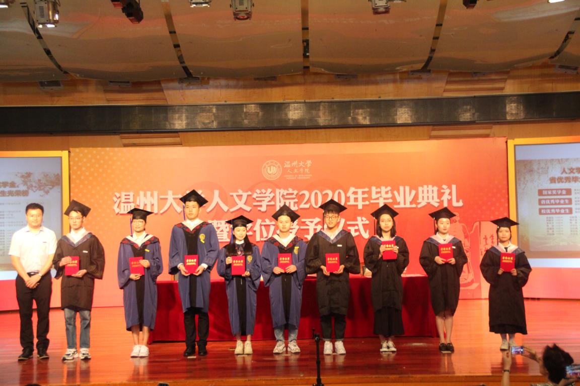 依依惜别之际,毕业典礼于庄重的全体齐唱国歌、校歌声中拉开了序幕。随后,孙良好院长在致辞中叮嘱毕业生们,即要能立定脚跟又要能胸怀天下。时刻做到“认识你自己”,追求“读万卷书,行万里路”,做有独立之精神、自由之思想的人。16历史班主任刘建国老师作教师代表发言,他带着毕业生们将大学生活再次回味了一遍,告诫学生们要永葆乐观向上精神,享受工作拼搏的乐趣、生活浪漫的情调,也要心怀感恩,学会回报母校和社会。之后,毕业生代表李林军和沈河滨分别发言,他们流露出对母校的眷恋不舍,同时也做出了对未来的美好憧憬。颁奖环节中,孙良好院长为我院国家奖学金、省优秀毕业生、校优秀毕业生获得者进行颁奖和表彰。随之,吴静书记为我院成功考博考研的学子颁奖,陈源源副院长为2020届校友联络员颁发聘书。仪式最后,由陈源源副院长宣读学位授予决定,孙良好院长为全体毕业生拨穗授礼。