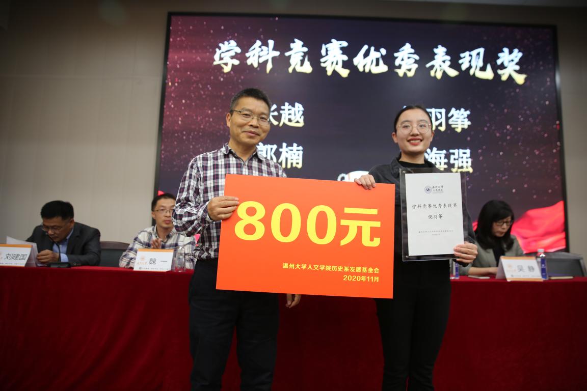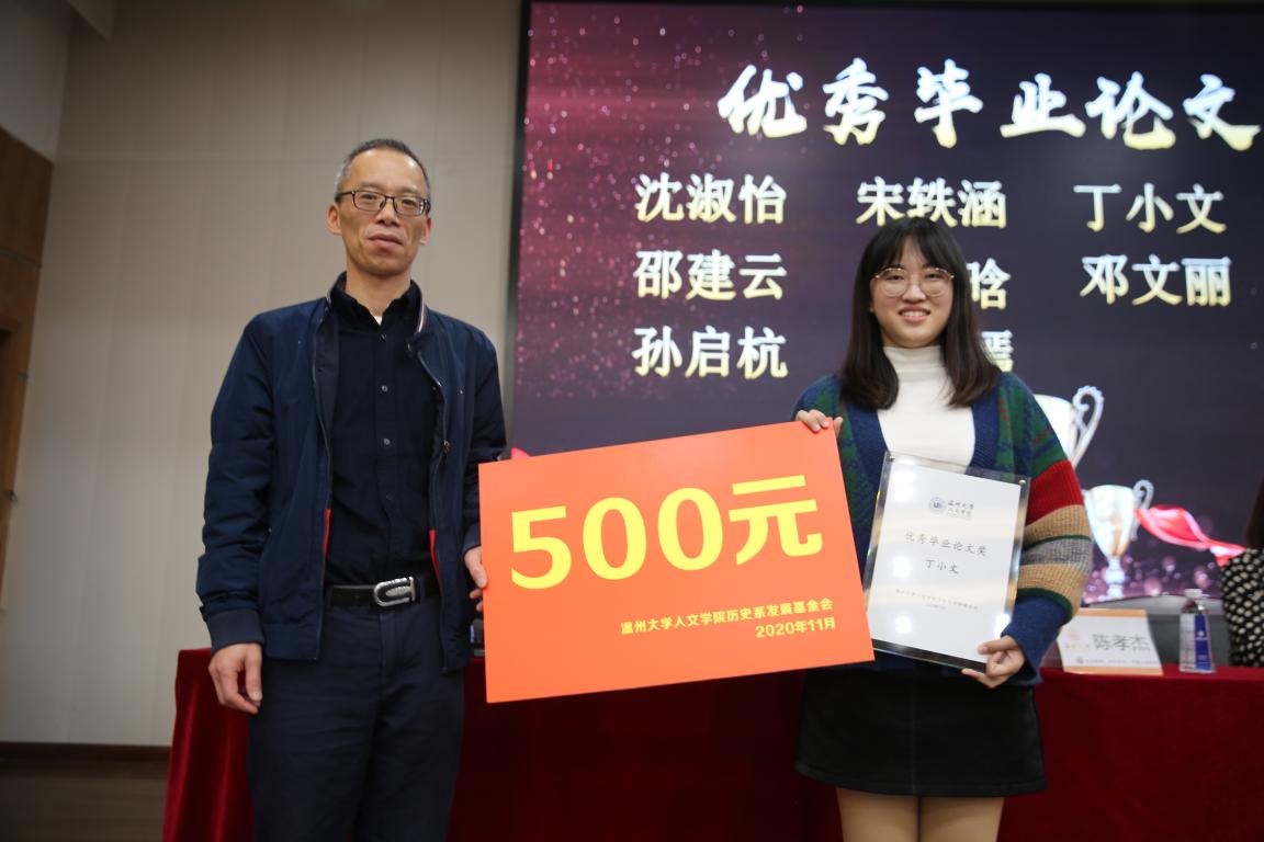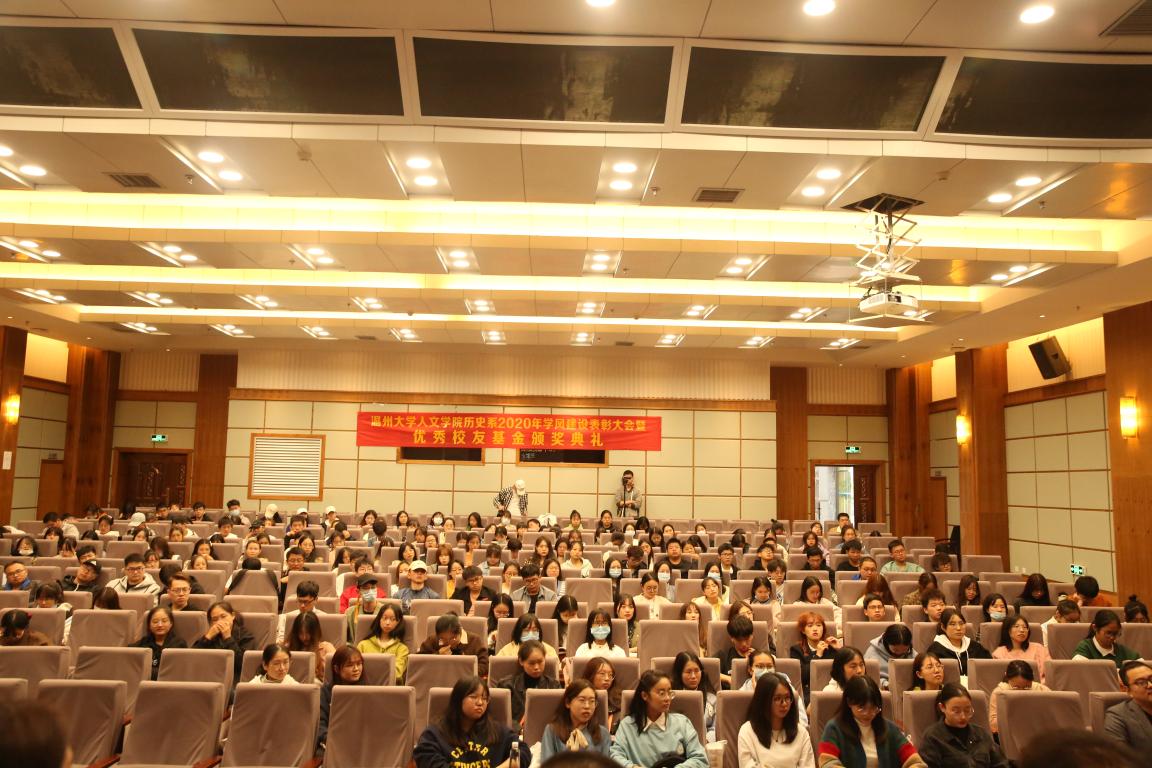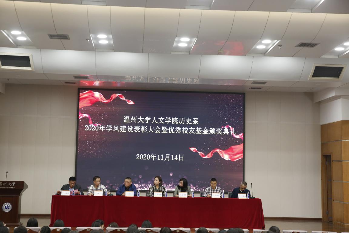 2020年11月14日14时,我院历史系2020年学风建设表彰大会暨优秀校友基金颁奖典礼于北校区信息楼报告厅举行。此次表彰大会暨颁奖典礼由我院历史系发展基金会会长刘建国主持,温州万全教育集团董事长陈孝杰、温州大学校友办主任陈宏毅、麻豆视频 党委书记吴静、副院长郑春生、副书记魏一、历史系主任尤育号以及历史系全体师生出席了此次会议。