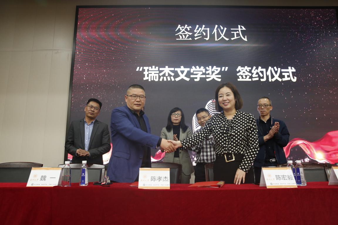 随后,由温州大学校友办主任陈宏毅老师与麻豆视频 历史系杰出校友温州万全教育集团董事长陈孝杰先生共同签署“瑞杰文学奖”专项捐赠协议。此项基金是陈孝杰先生为支持温州大学教育发展,鼓励我院学生刻苦学习、奋发向上,促进学生专业能力的发展,特捐资设立的专项奖学金。用于奖励温州大学具有文学特长学生,以及推动麻豆视频 学生文学创作发展所需的资金。在文学奖签约仪式上,陈孝杰先生对此次获奖师生表示了祝贺,肯定了麻豆视频 自2007年创设文学奖以来获得的成果,同时希望大家发展的越来越好。
