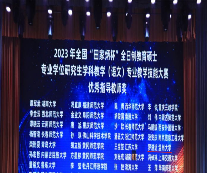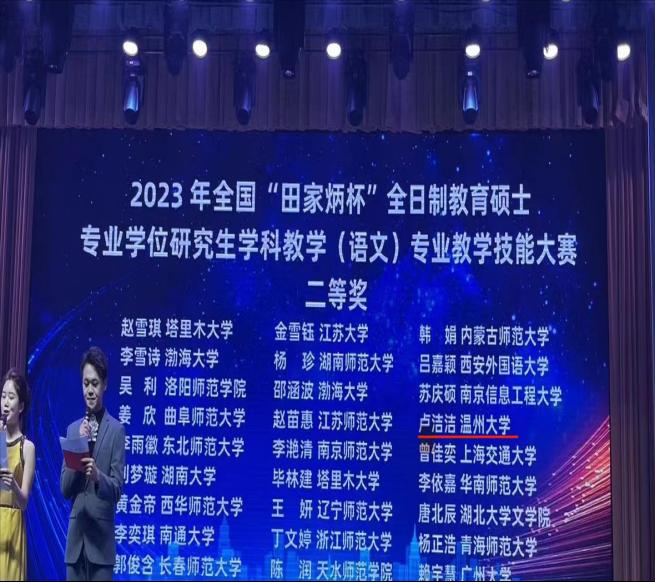 2023年10月14-15日,“田家炳杯”全日制教育硕士专业学位研究生学科教学(语文)教学技能大赛决赛在长春师范大学成功举办。我院2021级学科教学(语文)专业硕士研究生卢洁洁凭借扎实的专业基础和出色的教学技能荣获二等奖,同时罗进近老师荣获优秀指导教师。