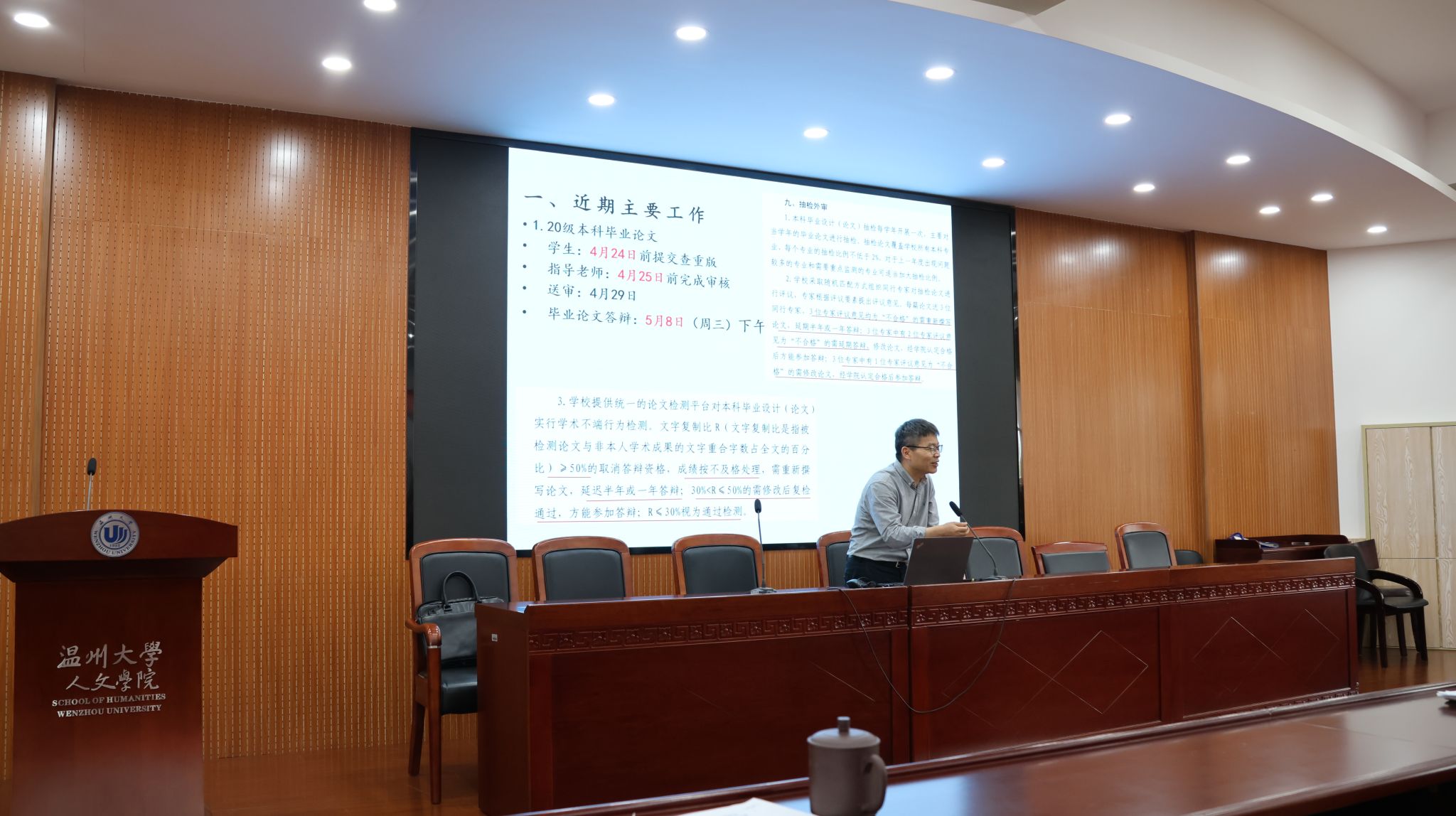 陈源源副院长首先对参与本次研究生招生工作的全体老师表示感谢,此次招生工作的圆满落幕离不开全体老师的辛苦付出,同时就研究生毕业论文答辩进行了说明,就本次国家社科基金的申报作了解读。