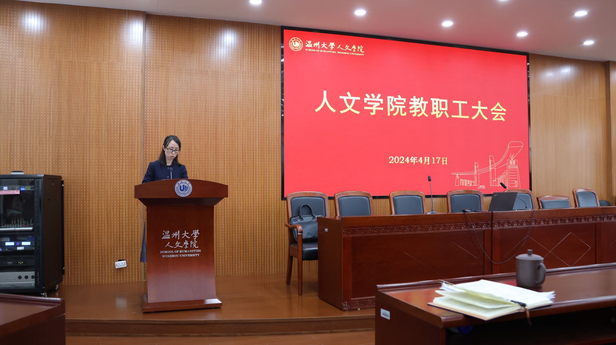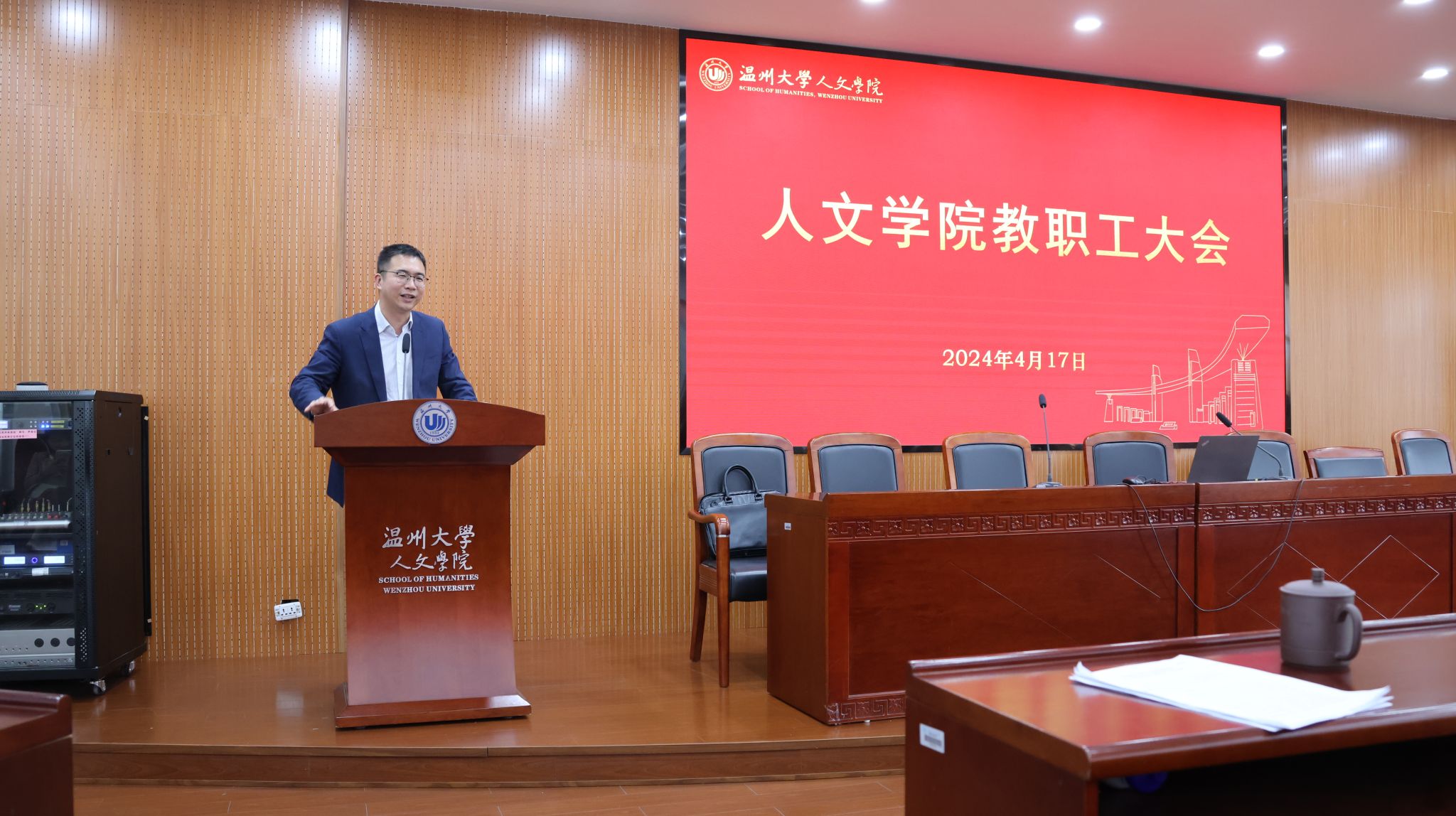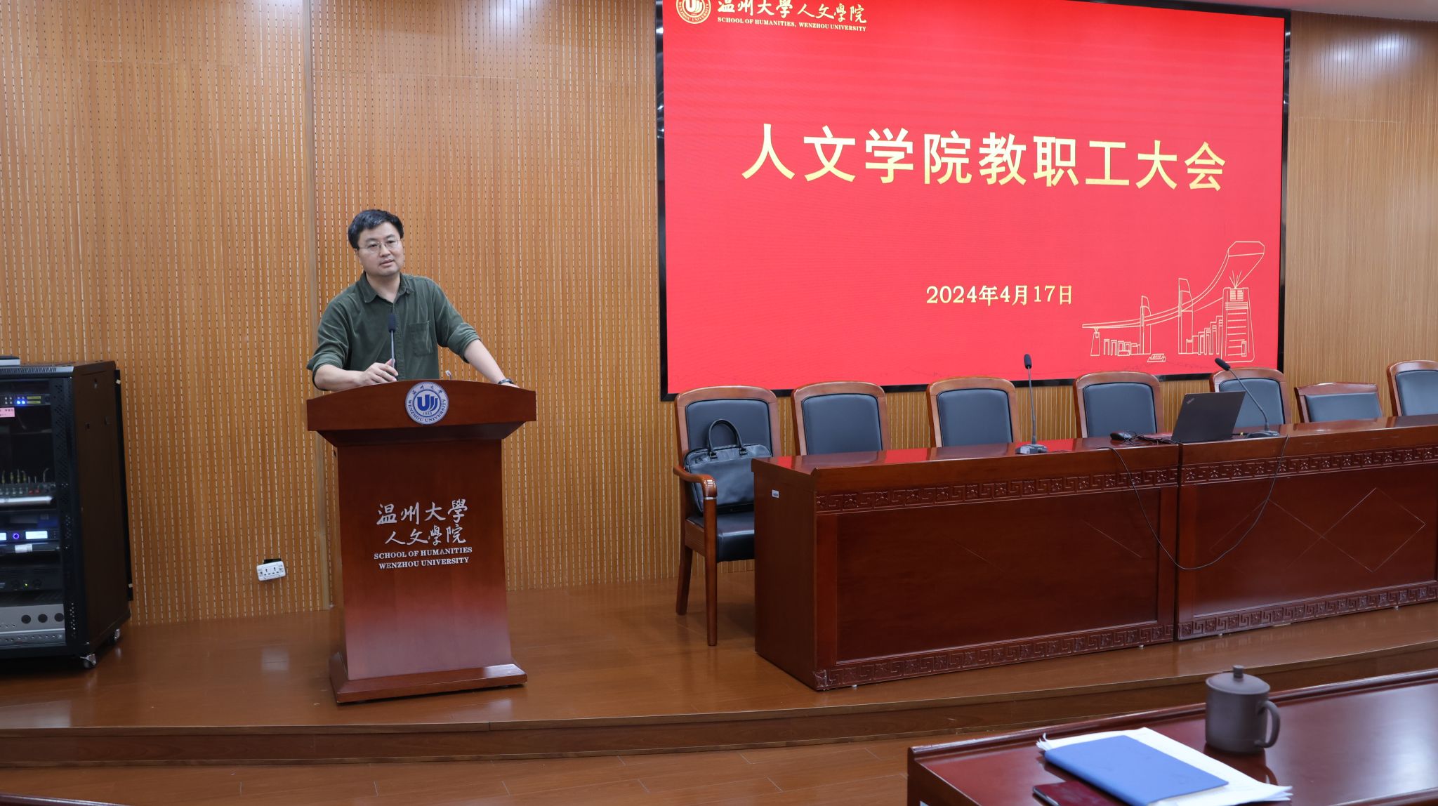 4月17日下午,人文学院教职工大会在人文楼203报告厅召开。学院领导班子及全体教职工参加会议。会议由院党委书记江秀景同志主持。