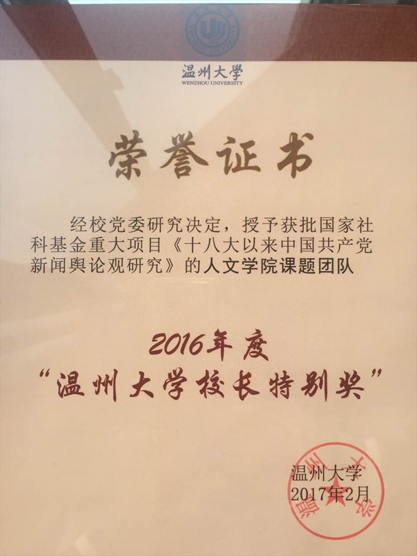 根据校党委会研究决定,我院国家社科基金重大项目《十八大以来中国共产党新闻舆论观研究》的课题组团队荣获2016年度“温州大学校长特别奖”。