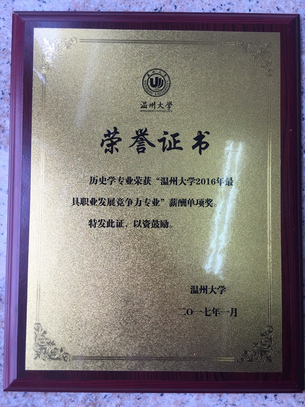 我院历史学专业荣获“温州大学2016年最具职业发展竞争力专业”薪酬单项奖称号,奖励五万元。