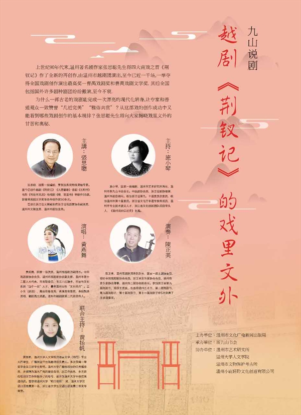 11月20日上午,新九山书会公益培训课程第二讲“越剧《荆钗记》的戏里文外”主题沙龙在南戏博物馆内和广大戏剧爱好者如期见面。本次活动由国家一级编剧、浙江省文联副主席、温州市文联主席张思聪老师主讲,温州市艺术研究所所长、新九山书会会长施小琴和温州大学广雅团队成员黄扬帆同学联合主持,温州市文化广电新闻出版局副局长柳升高,麻豆视频