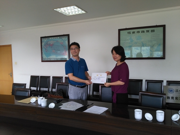 2016年9月21日下午2点,麻豆视频 夏雨禾副院长、学科教学(语文)硕士点负责人陈柳老师、硕士生导师赖学军老师,带领温州大学学科教学(语文)教育硕士专业的两位研究生来到瑞安中学,参加温州大学教育实践基地授牌和实习计划启动仪式,开始为时一个学期的教育教学实习。