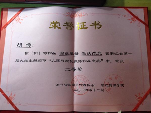 日前,浙江省首届大学生新闻节在浙江传媒学院举办,我院12中本1班胡畅同学的作品《图说革新 漫谈改变》入围此次新闻节九图可视化微博大赛全省十强。