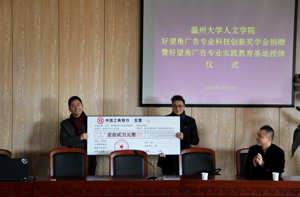 温州好望角房产营销策划有限公司向我院广告学专业捐赠人民币12万元,设立好望角广告专业科技创新奖学金,奖励在科技创新、学科竞赛以及学术创新等活动中表现突出的广告专业本科学生。该奖学金在每年上半年评审一次,每年设6个奖励名额,每人奖励5000元。学院将在温州好望角房产营销策划有限公司建设“广告专业实践教育基地”,双方将在广告学专业实践人才培养的模式改革、课程开放、特色教材建设、基地教学与管理、师资队伍建设等方面进行深度合作。