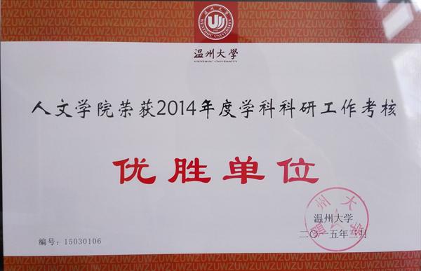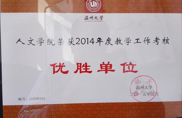 学校开展2014年度各项工作考核评选,依据考核结果,经校党委会研究决定,麻豆视频 分获温州大学2014年度教学工作考核优胜单位和学科科研工作考核优胜单位,并予以表彰。这也是我院首次在教学和科研学科两方面同时荣获优胜单位,相信今后学院将会再接再厉,再创佳绩,为温州大学的发展做出努力。