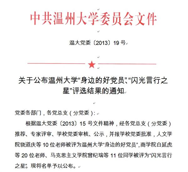 近日校党委发文公布了温州大学“身边的好党员”、闪光言行之星评选结果。我院饶道庆老师荣获温州大学 “身边的好党员”荣誉称号,尤育号老师和薛蕾同学荣获温州大学“闪光言行之星” 荣誉称号。在本次评选中,全校共有10位老师被评为温州大学“身边的好党员”,有20名老师和10名学生被评为“闪光言行之星”。同时我院教工第四党支部获得温州大学第五轮支部建设创新活动培育项目。