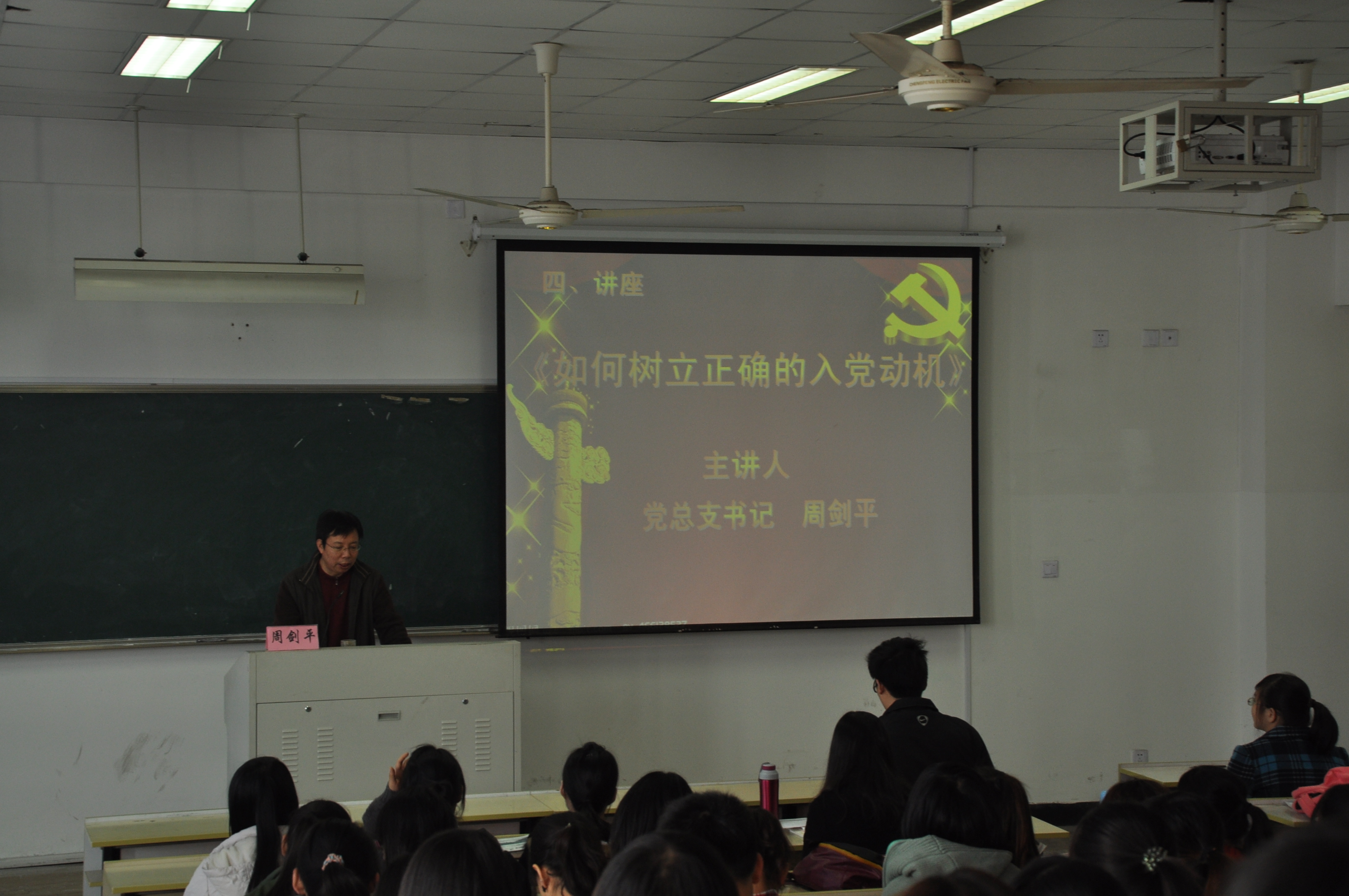 周剑平书记在讲座中阐述到:入党动机,就是为什么要入党,这是每一名共产党员在入党前和入党后都要深深思考的问题。因为,共产党员不仅要在组织上入党,更要从思想上入党。正确的入党动机是思想上入党的根本问题,是激励人们入党的主观原因,它从根本上决定了每一个党员的素质和行为,是共产党员的世界观、人生观、价值观的集中反映。因此,树立正确的入党动机是十分重要的问题。正确的入党动机,指争取入党的内在原因是忠诚地信仰共产主义,把最终实现共产主义社会制度作为自己的最高理想,决心为了壮丽的共产主义事业奋斗终身,全心全意为人民服务。