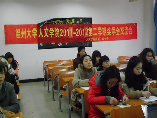 在2012年2月17日下午三点半,在北1-105教室,我院召开了奖学金交流会,邀请了09至11级的三个级段各班的班长和学委来参加。