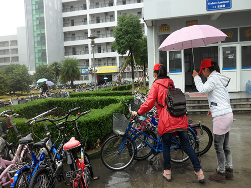 下午,天微暗,雨纷纷。但是,志愿者们还是守时地撑伞来到了C区的门卫处集合。他们迅速戴上小红帽,换上了志愿者的行头。在队长分配好任务,各自组队完成后,每个队向自己的目的地前去。雨点碎了一地,志愿者们走过一路水花。到了车队前,他们两两配合,你撑伞,我摆车,相当默契。最幸福的是在棚里排车的志愿者,免去了撑伞遮雨的不方便,效率就更高了。他们仔细地将倒在地上的自行车扶起来,将突出来的车推进去,小心翼翼地撑好车脚,还要站远了看一看是不是整齐,真是认真呢!志愿者们就这样努力着,付出着,任雨淋湿他们的手臂,他们的背脊,依旧开心地笑着。经过两个多小时的工作,志愿者们将C区各个宿舍楼下的自行车都整理好了。一列列的车整齐地排列着,C区看起来更加整洁有序了。志愿者们,撑着伞,在雨中渐渐隐去,本次活动也顺利落下帷幕。