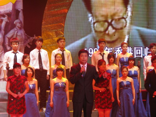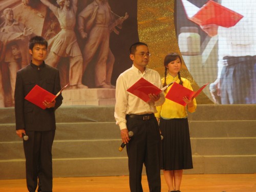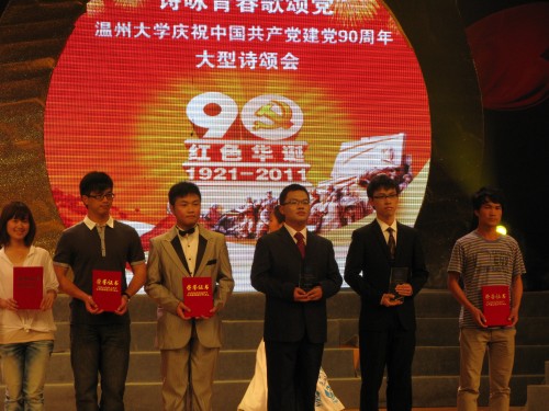 选送的群颂《我的祖国》以飒爽的英姿亮相舞台,在场师生掌声不断,来自我院的80名学生代表高呼“文韬武略,扬我人文”,充分展示了人文学子的良好精神风貌。最后校党委书记陈福生、副书记林娟娟与我院党总支副书记骆锤炼老师等全校师生代表共同演绎原创诗朗诵《党建纪元逾九十 歌颂党史唱温大》,令全场激情澎湃、荡气回肠,晚会达到高潮。大会在全场起立齐唱校歌的庄严氛围中,将爱党荣校的精神“润物细无声”深植入了全体温大人的心中。在上周三上演的庆祝建党九十周年诗歌朗诵大赛中,《我的祖国》获得群诵组第二名的好成绩,同时也荣获了“优秀创作奖”奖项。