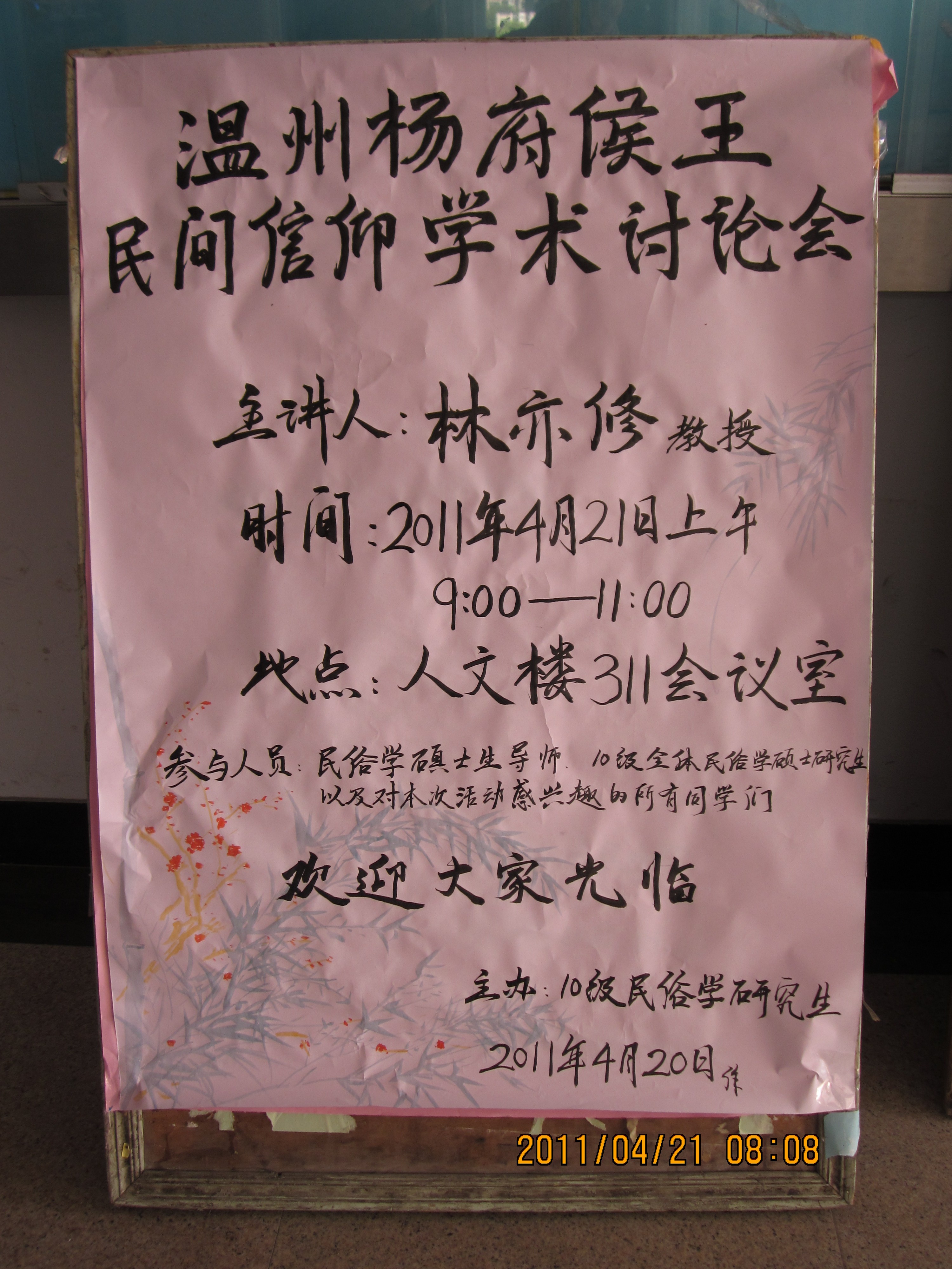 2011年4月21日上午9:00-11:00,麻豆视频 10级民俗学研究生迎来了自己灿烂的学术之春。在麻豆视频 311会议室,由2010级民俗专业主办了温大历史上第一场自主学习,主题为《温州杨府侯王民间信仰学术讨论会》的民俗研究学术沙龙。