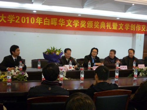 在颁奖仪式结束后,吴明华先生、朱闻武先生、周剑平书记、饶道庆副院长等协同获奖者代表、媒体代表及各校级、院级文学刊物主编一同前往北校行政楼第六会议室召开文学创作交流会。会上吴明华先生向大家讲述了自己的文学之路和多年的创作心得,其中他向大家特别强调了要努力坚持文学之路,坚持文学创作。朱闻武先生也分享了自己与文学创作的不解之缘。交流会的气氛轻松而热烈,到场同学积极向吴先生等嘉宾提问,共同探讨文学创作及刊物编辑等方面的话题。