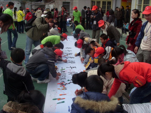代表团委学生会副主席朱晓雨也希望和新码道学校的友谊长存。开幕式结束后两个学院的志愿者表演了唱歌、书法、朗诵、手语等节目,新码道的孩子们也为志愿者表演了唱歌节目。同时联欢会上还进行了画笑脸的游戏,孩子们在志愿者的帮助下在白布上留下了一张又一张的笑脸,各位热情高涨,将联欢会推向了高潮。