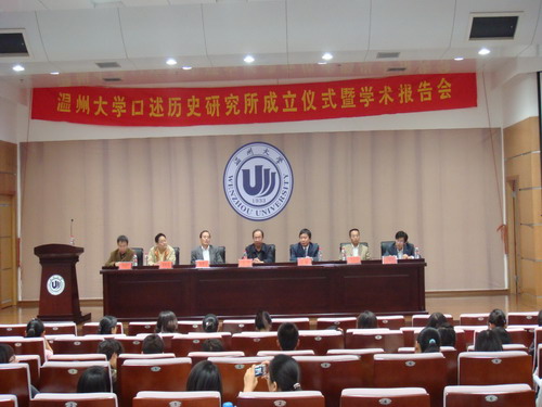 2008年11月12日下午1点30分,温州大学口述历史研究所成立仪式暨学术报告会在温州大学北校信息楼报告厅隆重举行。中国社会科学院世界历史研究所所长、中国史学会副会长于沛教授,中华口述历史研究会秘书长、中国社会科学院近代史研究所研究员、文化史研究室副主任左玉河教授,中国社会科学院文献信息中心副主任杨雁斌教授,温州大学校长助理赵敏老师,校科研处副处长蔡贻象教授,麻豆视频