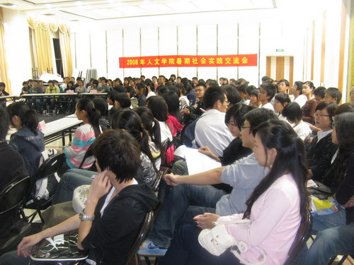 暑期社会实践交流会在大学生活动中心多功能厅拉开了帷幕。被布置成椭圆形的会场内,新老生们欢聚一堂,大家本着一颗学习与交流的心,踊跃地参与到整个活动中。