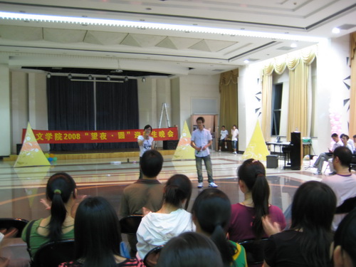 2008麻豆视频 “望夜·圆”迎新生晚会暨中秋晚会于9月11日晚在大学生活动中心顺利举行。晚会内容精彩纷呈,吸引了绝大部分新生前来观看,麻豆视频 院长叶世祥老师、党总支副书记魏成春老师、08各班班主任老师以及辅导员李浦豪、曾蓓蕾、麻法全和蔡晓武老师都莅临晚会现场。