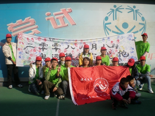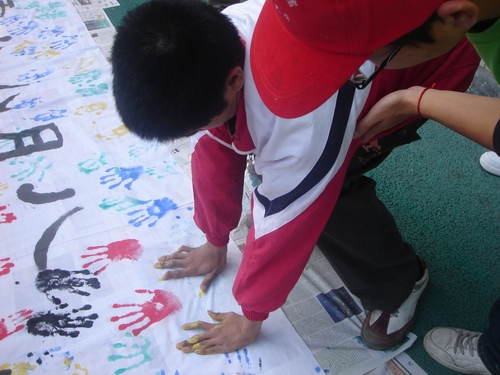 中午,大家匆忙地解决午餐踏上了去新码道的路程。新码道的师生们对我们的活动积极配合支持,在我们到来之前就在操场上排好了队耐心地等待着。在我们到达新码道之后,我们就紧罗密鼓的开始了我们的活动。本次活动我们拍下了八十八位孩子的笑脸,孩子们的笑脸阳光灿烂,无比纯真可爱,充满了对08奥运的祝福。接着,我们把八十八位小学生分为4组,由于这些孩子都是智障儿童,我们安排志愿者带领着孩子用奥运五环的五种颜色在早就准备好的白布上印上自己的手印,这个活动孩子们热情高涨,气氛活跃,用自己的双手来支持北京奥运。再接下来,孩子们在我们带去的小纸条上写下了自己对北京奥运的祝福。