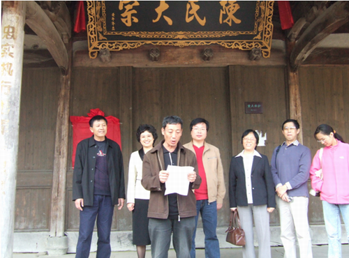 仪式在芙蓉村“陈氏大宗”祠庙前进行。上午十点,由永嘉岩头镇人大李副主任主持仪式;芙蓉村村委会主任陈继仁代表芙蓉村村民热烈欢迎温大师生的到来,感谢温大民俗学对发掘芙蓉古村落的非物质文化遗产的研究工作;同时介绍了芙蓉村的经济文化、旅游事业的发展现状。温州大学民俗学研究所负责人、硕士生导师邱国珍教授发表讲话,阐明设立民俗学教学研究基地的意义及芙蓉古村落独特的民俗学研究价值。岩头镇人大主任戴小明和邱国珍教授共同揭牌,“温州大学民俗学教学研究基地”的牌子挂于芙蓉村“陈氏大宗”祠庙大门上。
