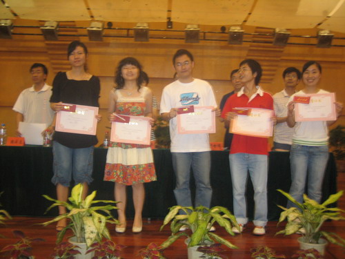 07届省优秀毕业生以及优秀毕业论文的获奖名单,领导们为他们颁发了证书。另外,本届考研也取得了十分优异的成绩,领导们也为其颁发了奖金。特别值得骄傲的还有我院07届毕业生在激烈的竞争中获得了到西部服务的机会,陈艾华书记及叶世祥院长为她们佩带红绸带,并献上了学院的祝福。