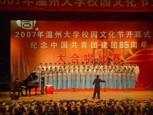 4月26日晚,温州大学为纪念中国共青团建团85周年,温州大学大学生活活动中心演艺厅举办了一场大型合唱比赛,歌唱祖国,歌唱青春。