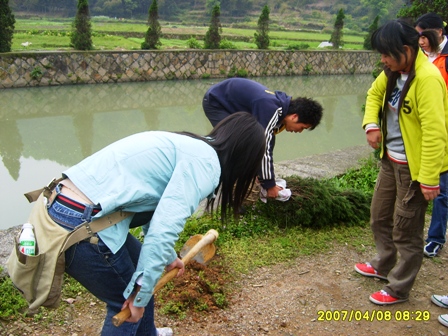 考虑到树苗的成活率以及在绿化方面的作用,大家准备了生命力较强的冬青树。活动尚未开始,同学们的热情都已高涨,纷纷挽起袖子跃跃欲试。待合理的分配完树苗,划好各自组的“责任地”,植树正式开始。由于前几天的降雨,这里的泥土稍嫌泥泞,但是同学们你锹洞,我培土,你扶树,我踩泥,忙得不亦乐乎。经过同学们的努力,树苗整齐的排列在河岸上,仿佛是一排戎装卫士,气派十足。有了每个人的积极参与,所携带的树苗不到一个小时就全部种完。