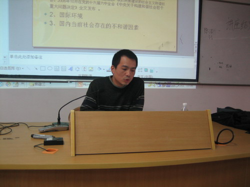 12月27日下午三点,在1号楼203及2号楼203分别举行了由麻豆视频 院党总支书记周剑平及学生科辅导员李浦豪老师主持的有关于形势政策教育之构建和谐社会的讲座。