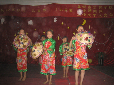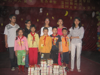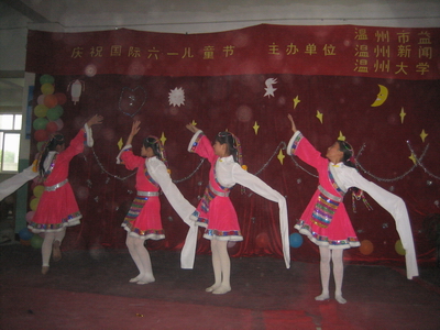 在温州市区,有这样一所学校,她是一所“新温州人”子弟学校,叫益民学校。在异乡的日子里,这里的学生,渴望能同样样接受教育,是益民学校,圆了他们纯真的愿望。然而由于诸多方面客观条件的限制,软硬件设施的配置皆与市区其他学校有一定差距。这里的学生,渴望能拥有更好的条件,渴望得到更多的关怀。正因为如此,他们,受到了了社会各界的极大关怀,于是,一颗颗爱心在这里盘旋,一股股暖流在这里奔涌。为了让我们的人文精神能在他们中间开散,我们的爱能在他们中间坚守恒久的温暖。我院于今年4月12日,在益民学校进行了青年志愿者活动基地挂牌授旗仪式,益民学校正是成为我院的青年志愿者活动基地之一。之后,我院志愿者在此开展了一系列富有影响的志愿者献爱心活动,如05中本一班的志愿者们在4月下旬就组织了一次爱心支教活动,受到了益民师生的一致好评。至05中本一的活动一月有余,又逢端午佳节,同时又紧紧相挨“六一”国际儿童节这一属于儿童的节日,益民学校与我院及温州新闻网共同主办了益民“六一”文艺会演。我院志愿者艺术团中05历本和05中本二的成员们共二十人参加了这次会演。