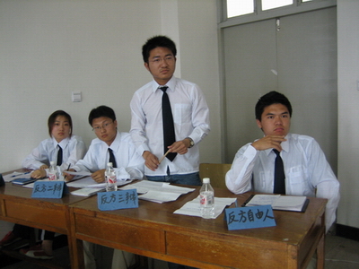 此次辩论赛在正方辩手的妙语连珠和反方辩手的老歌合唱中拉开帷幕。05中本一班与04中本三班围绕博客对社会的影响利大于弊或弊大于利的辩题进行驳辩,在双方攻辩与自由辩论阶段,比赛进入高潮,现场气氛热烈。双方语言犀利,措辞严谨,辩得难解难分,真的是公说公有理,婆说婆有理。精彩的自由辩论之后,双方四辩总结陈词。最后,万军老师就双方的表现做了精彩的点评。