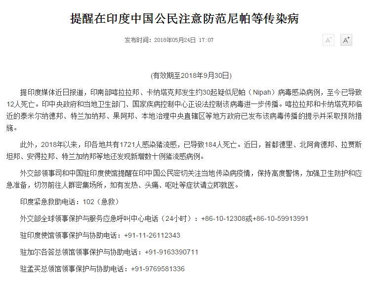 根据中国领事服务网通告,近期印度南部喀拉拉邦、卡纳塔克邦发生约30起疑似尼帕(Nipah)病毒感染病例,已造成人员死亡事件。因此,经学院和学校国际交流与合作处商量决定,取消2018温大师生暑期赴印度韦罗尔理工大学访学项目。