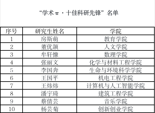 依据《关于举办温州大学2025年研究生“学术π擂台赛”活动的通知》要求,经学院推荐、学校审查及专家组评审,拟评选教育学院房斯萌等10位研究生为“学术π·十佳科研先锋”,现将名单予以公示。