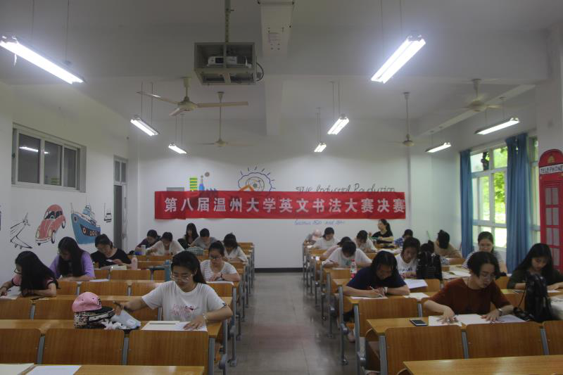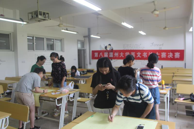 本次比赛分为团体组和个人组,团体组需要按照现场给出的主题进行作画,要求融入书法元素,并在两个半小时内完成画作。个人组的参赛选手需要在一个小时内独立完成一份指定英文诗的书法作品,字体不限。在比赛中,个人组的参赛选手们都全神贯注地思考如何书写指定的英文诗篇,有的选手一拿到诗篇,便开始创作,一个个优美的英文字母跃然于纸上;有的选手则陷入了沉思,仿佛在思考如何将这首诗用最优美的书法展示出来。参赛选手各具风格,书写作品也是千姿百态,这其中也不乏让人惊叹的书法作品。团体组的选手们以团体为单位,对于现场给出的主题“youthquack”进行即兴创作。各组成员展开了热烈的讨论,进行创意构想。每一组都在有限的时间内,集思广益、着手创作。最后,在组员们完美的配合下,各组都呈现了一幅幅既包含了书法元素又融入了绘画元素的优秀作品。