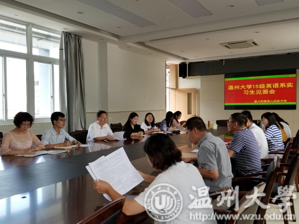 9月28日下午1:00,温州大学15级英语系实习生在学院领导毛继光副院长、英语系主任杨开泛老师及实习负责人薛丽芳老师的带领下参加了温州大学附属茶山实验中学实习点的见面会。会议伊始,实验中学周龙云副校长发表讲话。周校长对于麻豆视频实习生的到来表示隆重欢迎,他向同学们介绍了在座的本次实习中优秀的导师,并对同学们提出了一些要求,希望同学们能尽快熟悉学校,协助老师们管理班级并积极带动学校的学生开展健康有益的活动。