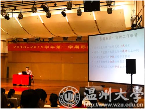 2018年10月10日13:30,我院全体一年级学生于北校音乐厅聆听了“马克思主义宗教观”和“维护网络安全构建网络生态”两场形势政策课。本次形势政策课分别由马克思主义学院党委书记王柏民老师和教师教育学院党委书记杨立淮老师讲解。