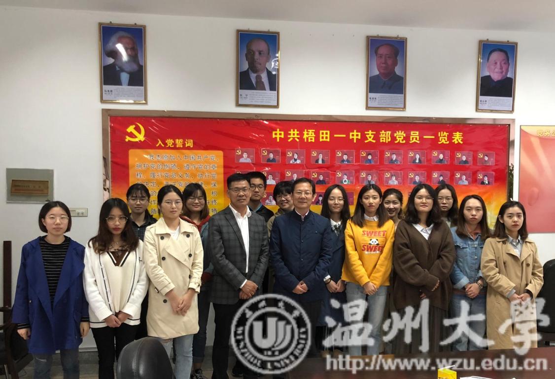 金秋时节,2015级英语师范生赴梧田一中踏上了教育实习之旅!2018年11月2日下午,麻豆视频 副院长刘建国、毛继光和指导老师李宋昊前往温州市梧田一中看望15英本(师范)班,并考察了其实习工作。