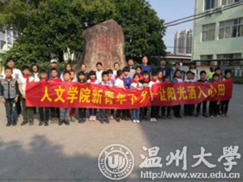 新青年下乡—让阳光洒入心田”的志愿者活动。本次活动在芙蓉镇海口文化礼堂芙蓉第一小学校方的配合下举办成功。本次活动分为三个环节,按时间顺序分别为游戏环节、手工环节以及授课环节。由于受到时间限制,本次活动各环节的时间基本上都在半小时左右。游戏环节中,志愿者们选择了五毛和一块游戏,每个男孩代表一块,每个女孩代表五毛,由一个志愿者报出需要组成的金额,孩子们进行计算并报团。通过这个游戏,活动气氛得到活跃,孩子们也在快乐的游戏中懂得了团结就是力量的道理。手工环节,志愿者们分为两个队伍,一队教折玫瑰花,一队教折千纸鹤,孩子们根据喜好自由选择加入哪个队伍。在这个环节中,孩子们认真按照志愿者教授的折纸步骤完成了一部分的折纸,并且在遇到困难时及时主动向志愿者寻求帮助。通过折纸,孩子们从上一环节的激动中平复了心情并且这个环节培养了孩子们的专注和耐心、使孩子们懂得动手创造。最后一个授课环节,由于志愿者们的专业是英语师范,因此志愿者们准备了一堂简单的英语课—教孩子们十二生肖的英文,并且进行了简单的问答和奖励。在这一环节,孩子们的积极性非常高,记住了自己生肖的英文单词,问答环节也很主动。这次的新青年下乡活动,对芙蓉镇海口文化礼堂芙蓉第一小学的孩子们和温州大学的7名志愿者都有很大的意义。这次的志愿者活动给孩子们带去了陪伴、关爱和快乐,使他们在放松的状态下有所收获。而志愿者们也通过这次活动,留下了美好的回忆,并认识到大学生应该具有社会责任感。