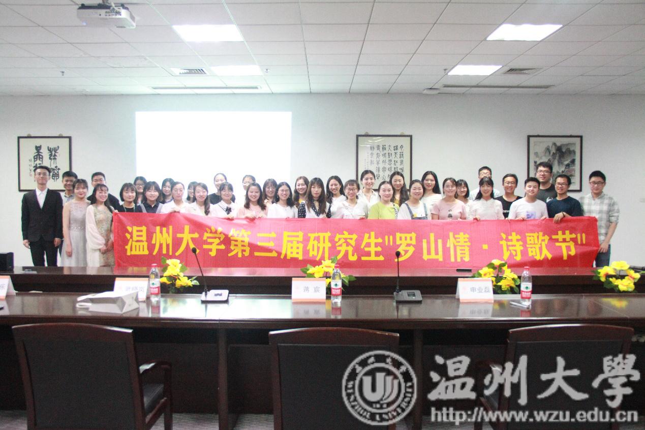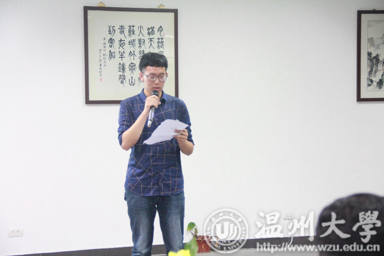 2019年5月26日晚18:30,温州大学第三届研究生“罗山情·诗歌节”决赛在育英图书馆二楼B213如约举行。本次大赛由赵丽娜、吴景润主持,特邀我院蒋宸老师、研究生部辅导员武晓岚老师、申业磊老师及我院研究生会主席郭佳乐作为参评嘉宾。7位进入决赛的选手参加了此次比赛。