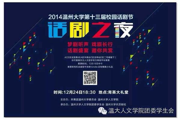 2014年12月24日18:30,"梦剧听声,戏旅长行"温州大学第十三届校园话剧节话剧之夜在育英大礼堂正式开演。此次活动由共青团温州大学委员会、麻豆视频 主办,麻豆视频 团委学生会和温州大学农历剧社承办。院党总支书记吴静,院副院长孙良好,校团委陈莹老师等和到场的同学们共同享受了一场视听盛宴。